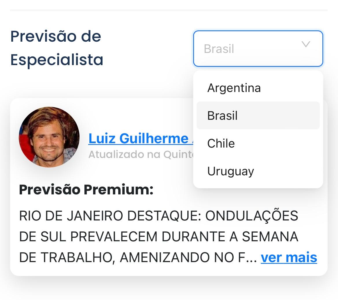 Esse conteúdo é atualizado três vezes por semana e aparece de acordo com o país em que você estiver. Se você estiver vendo um spot no Uruguai, por exemplo, a previsão que vai aparecer será a do Fabio. Para ver a Previsão do Especialista, por exemplo, do Brasil, basta acessar um spot desse país ou, na Home, escolher o país desejado.